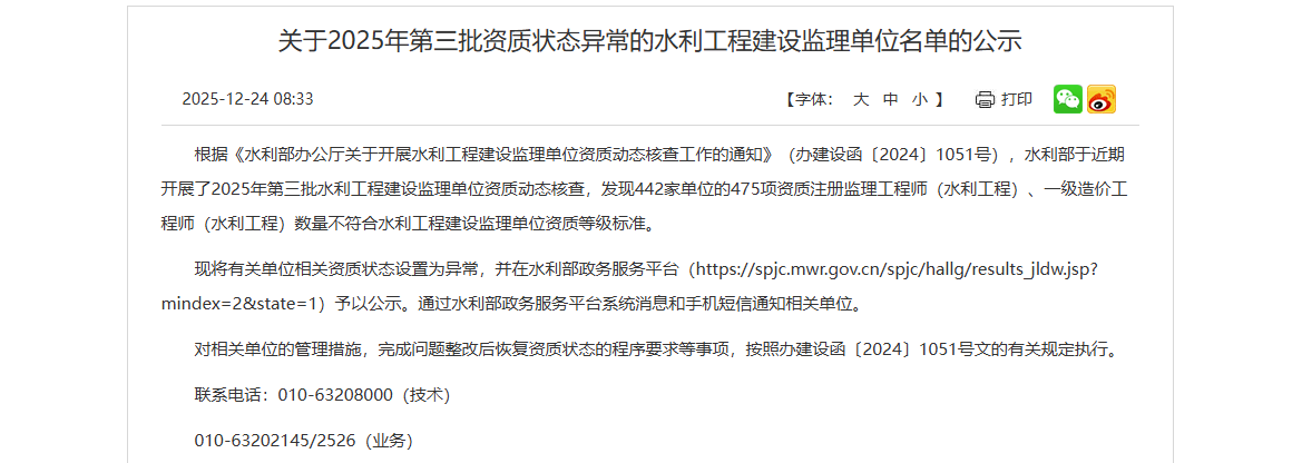 關于2025年第三批資質狀態(tài)異常的水利工程建設監(jiān)理單位名單的公示