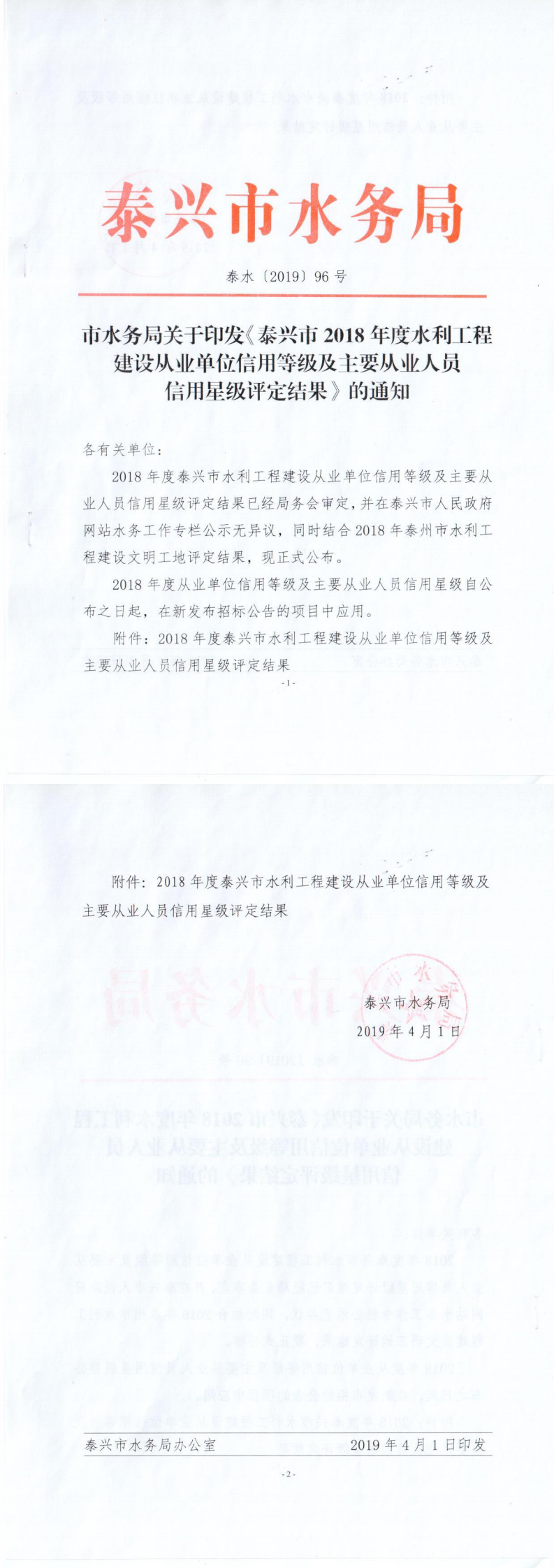 2019年4月1日,泰興市是水務(wù)局印發(fā)《泰興市2018年度水利工程建設(shè)從業(yè)單位信用等級及主要從業(yè)人員信用星級評定結(jié)果》,我公司在泰興市2018年度水利工程建設(shè)從業(yè)單位信用等級被評定為A級,主要人員何風(fēng)明信用星級為2星。